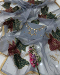 Paired with a luxurious organza dupatta that features exclusive hand-painted designs, this piece is nothing short of a wearable work of art. The dupatta is further enhanced with heavy fancy embellishments, creating an elegant frame with its richly finished edges. The perfect accessory to elevate the overall outfit, it adds movement, colour, and a statement to your look.