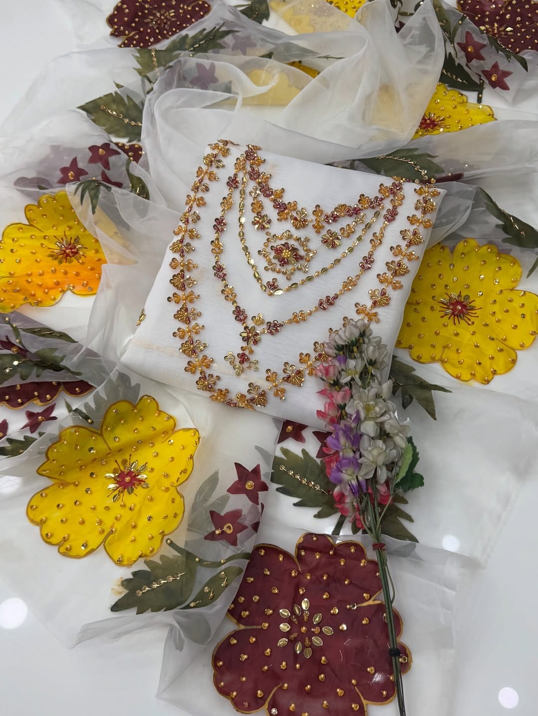 • Organza Shirt – Botqui-style design with intricate Zarri embroidery and Nagina (stone) detailing for a rich, embellished look