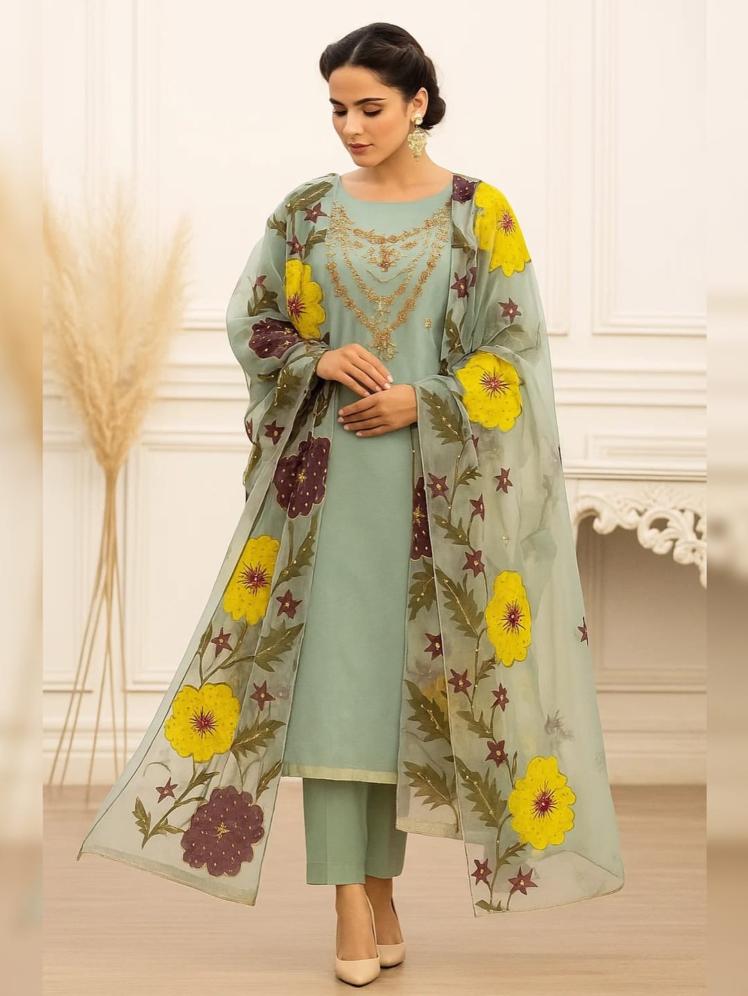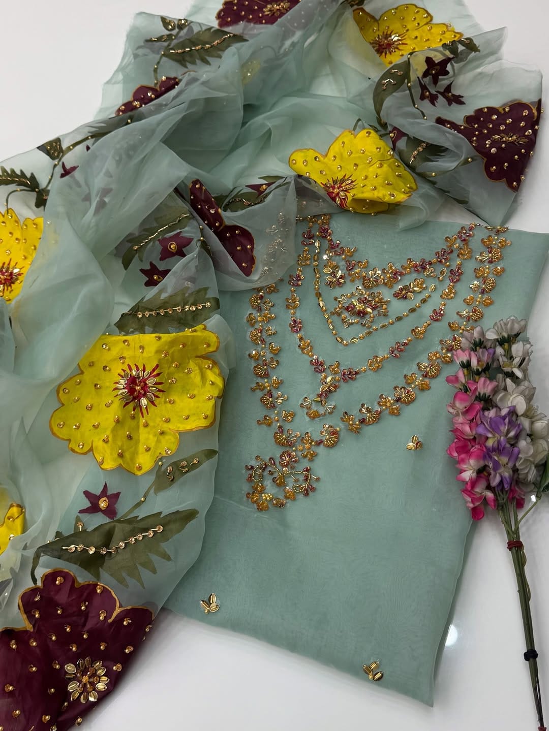 • Organza Dupatta – Fully finished with Oil Paint Nagina Work and embroidered 4-side borders, adding shimmer and grace