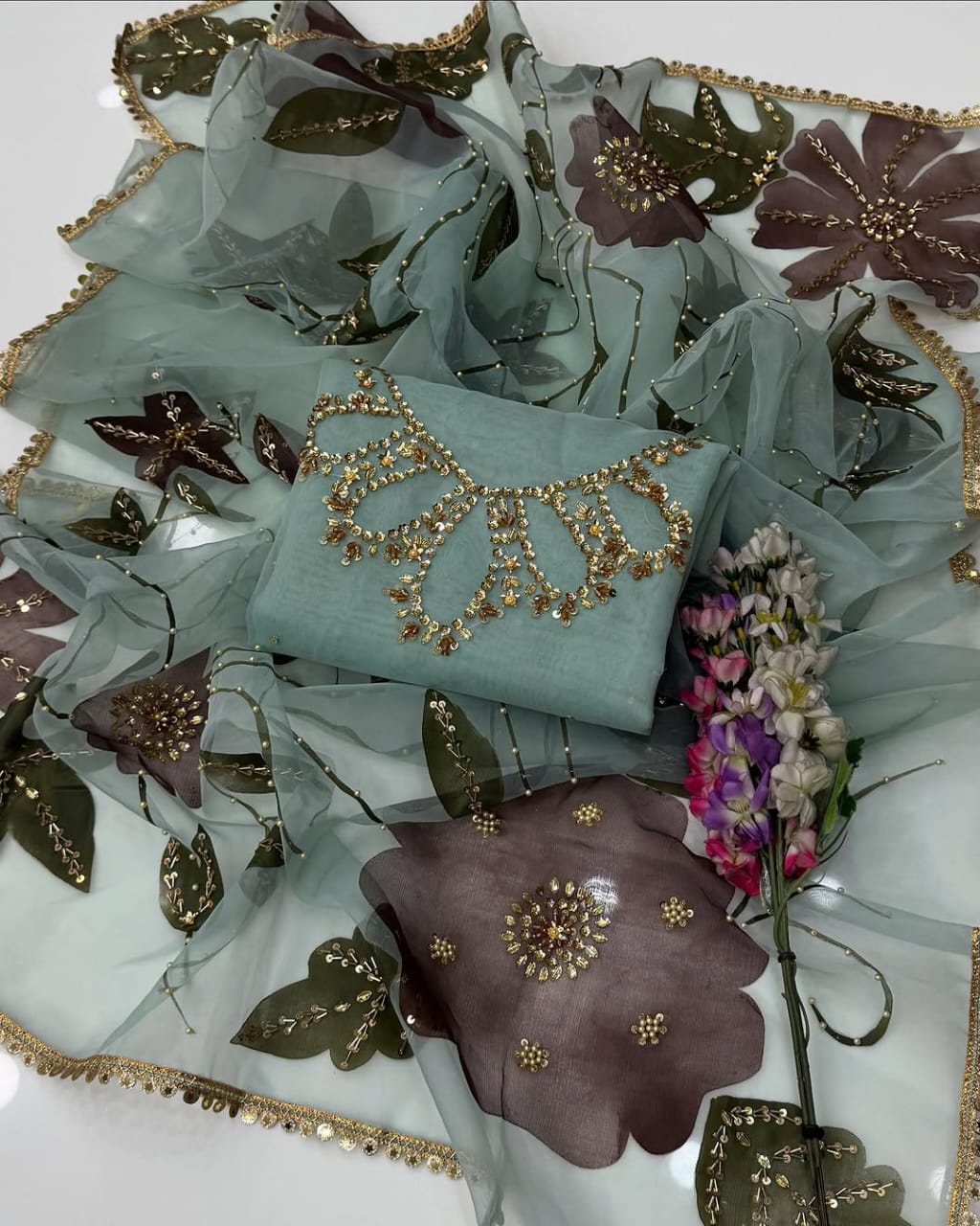 ✅ Dupatta: Beautiful oil paint organza dupatta, delicately adorned with handworked zari and beads, finished with a 4-side lace border for a graceful drape.