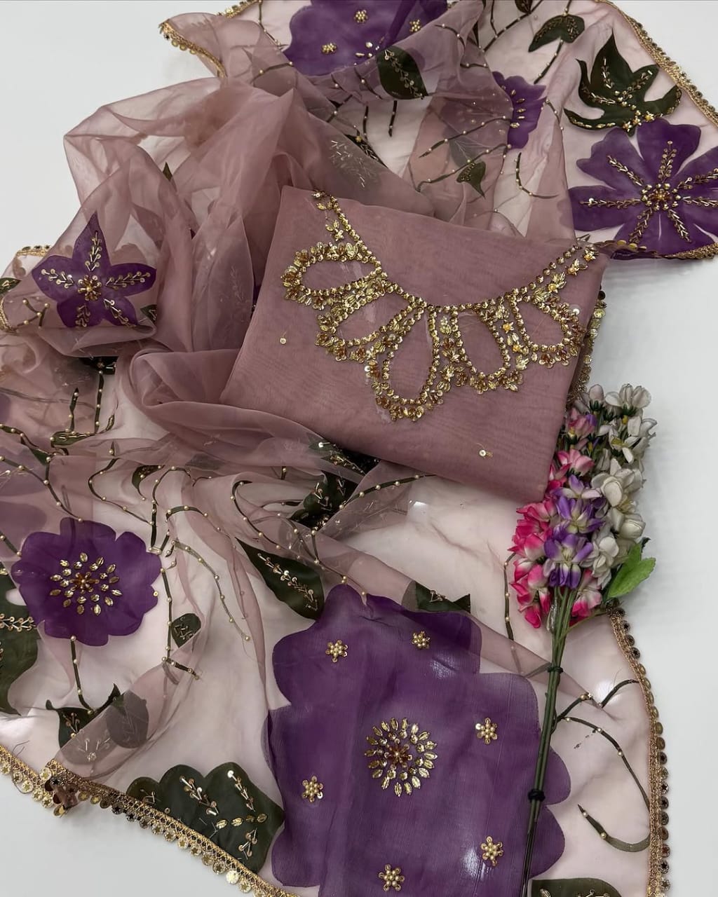 ✅ Shirt: Crafted in rich organza, this stunning piece features exquisite handwork with stones and beads, adding an elegant shimmer and artisanal detail to your look.